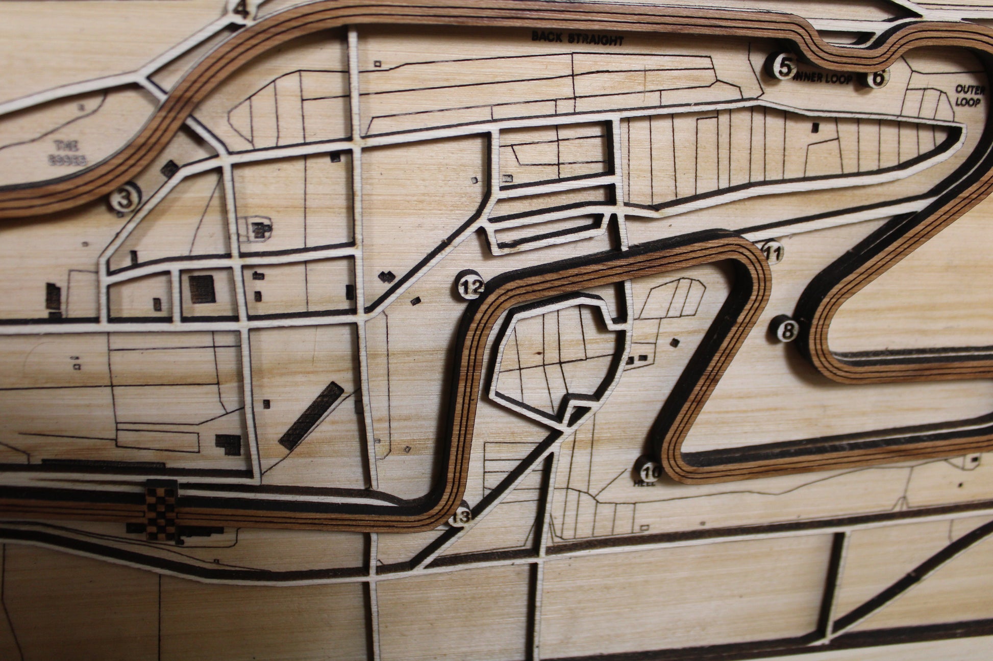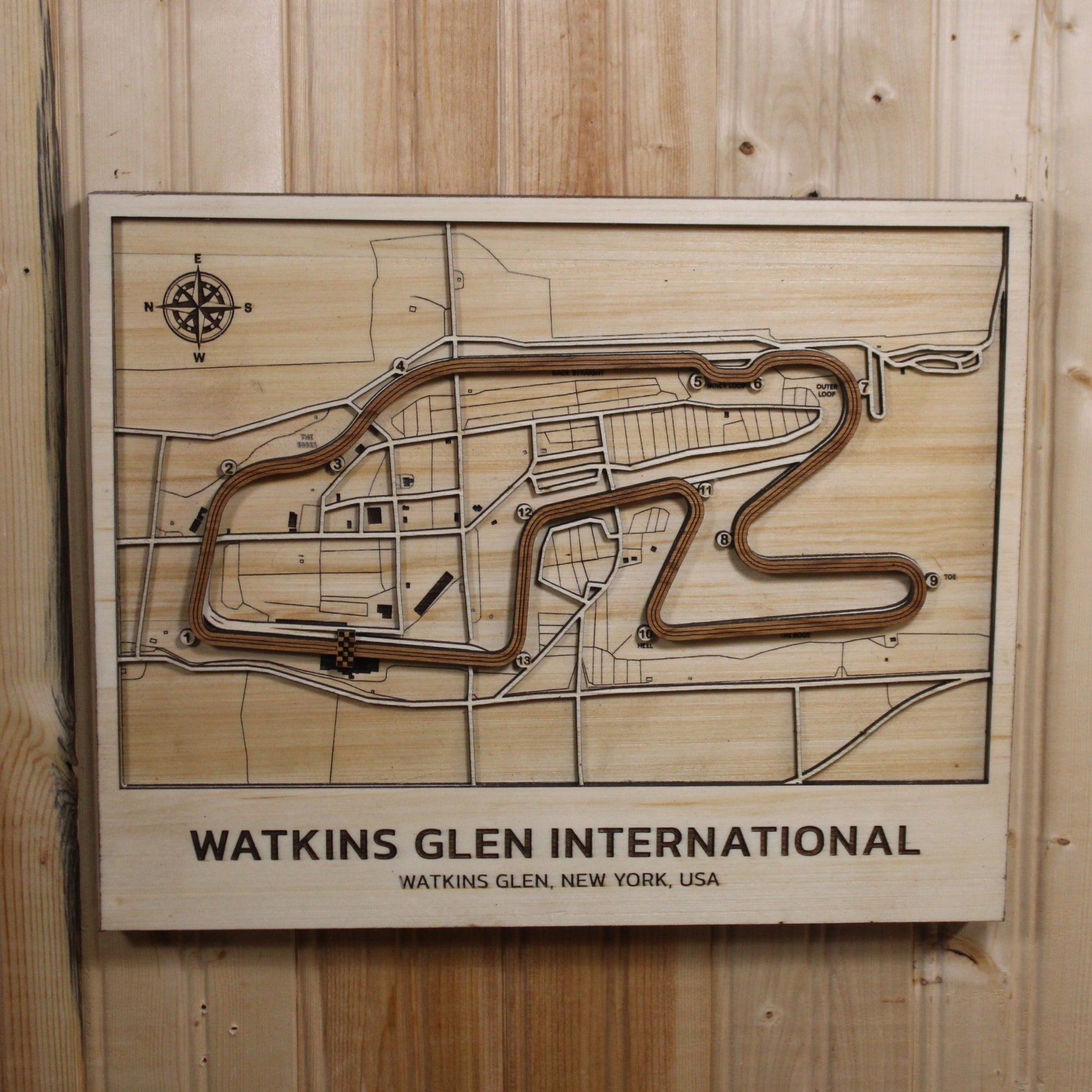 This Watkins Glen International Race Track Wall Map is a surefire favorite for NASCAR fans and is a great, unique wall decoration that you can use to showcase a favorite racetrack. This map is multi-layered, featuring an accented, raised track and an engraved location label on the frame. There are two hanging slots on the back of the map for easy display.