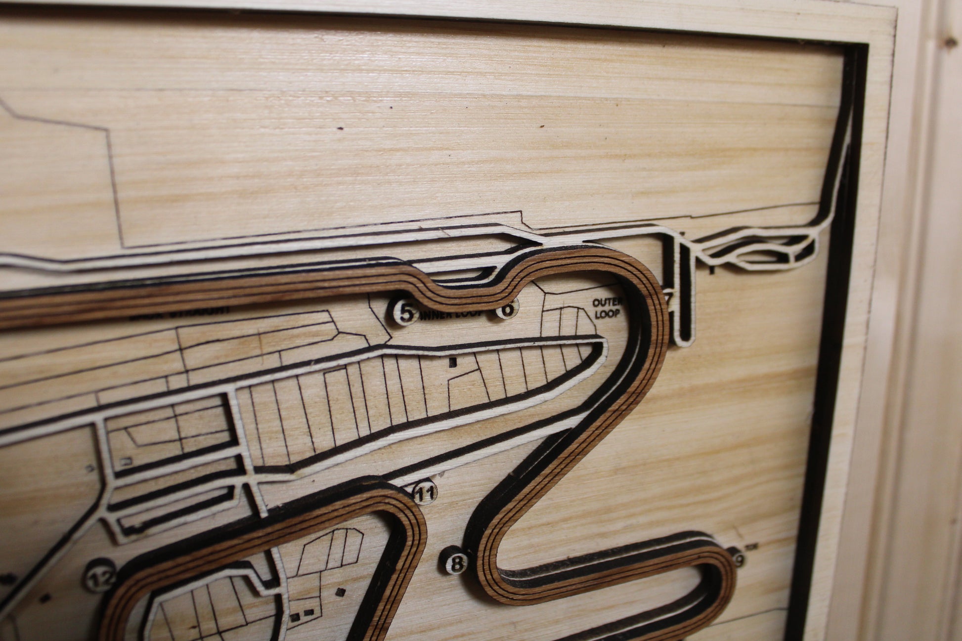 Overall dimensions are 15" x 12". Made of Poplar, with an Oak base. The racetrack outline is made of Cherry, giving it a distinctive, emphasized look.